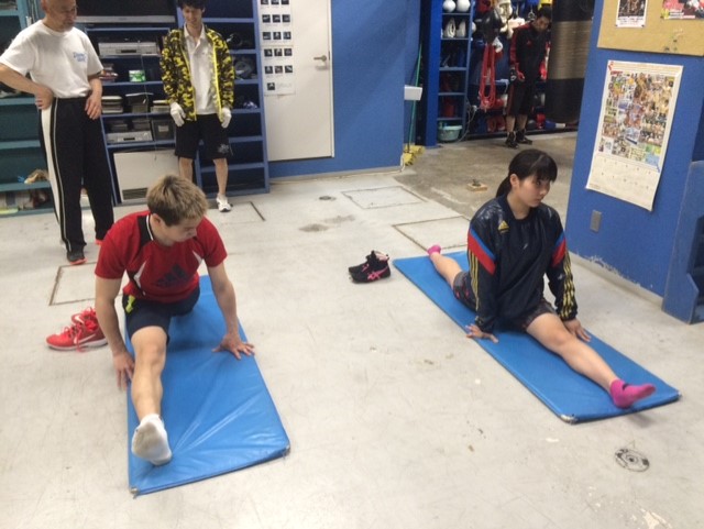 ジムではトレーニング前にマットを引いて皆、柔軟体操から始めます。