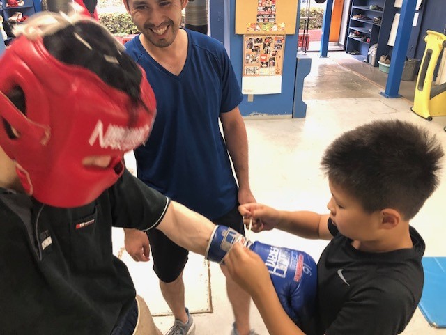 基本的にマスボクシングを行うようになった選手や般会員さんには、グローブやファールカップの紐を結ぶ手伝いをお願いすることがあります。