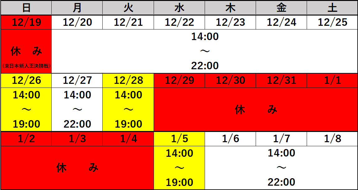 12月28日(火)         14~19:00の短縮